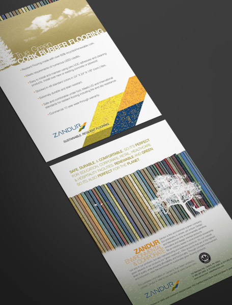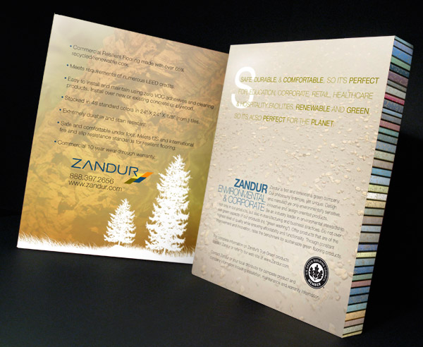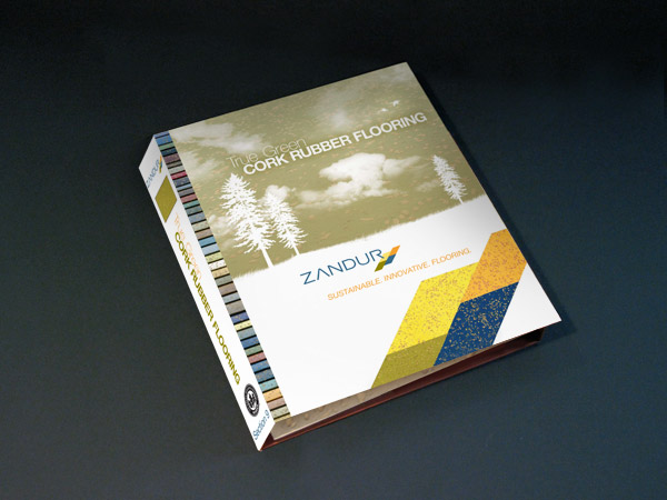 A manufacturer of recycled rubber and cork combination flooring, Zandur requested that SP+O develop a sample binder and sell sheets. Utilizing natural elements, SP+O ws able to highlight the environmentally responsible nature of Zandur’s product while establishing the flooring as a premium product.