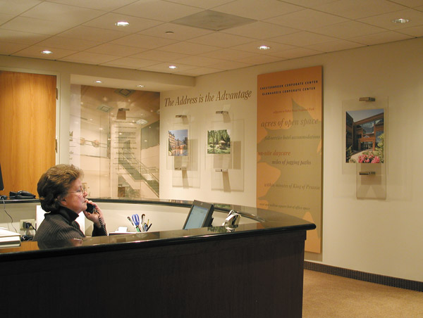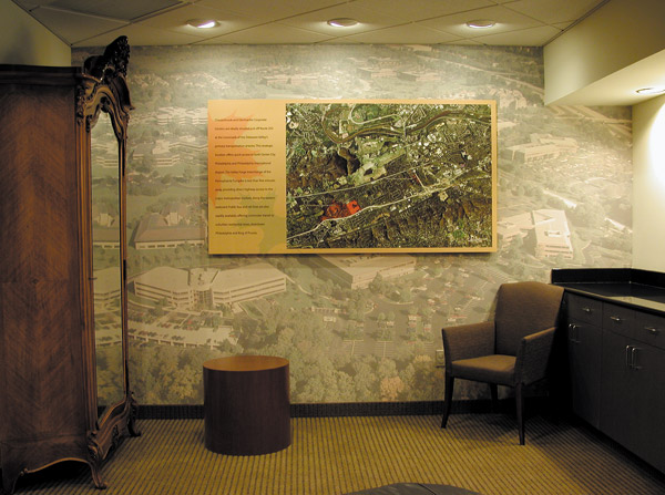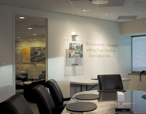 When Fox Management, a premier real estate developer in the western Philadelphia suburbs, wanted to differentiate themselves, they called on SP+O. Fox had identified a need for a sophisticated sales center to distinguish themselves in this highly competitive market. SP+O utilized existing photos of Fox commercial properties and areal/satelite photography as foils for informational graphic panels. In addition, stylish floating frames were designed to display meticulously selected photographs. Coordinating colors and elegant typography flow between all rooms, uniting the space with a singular graphic aesthetic.
