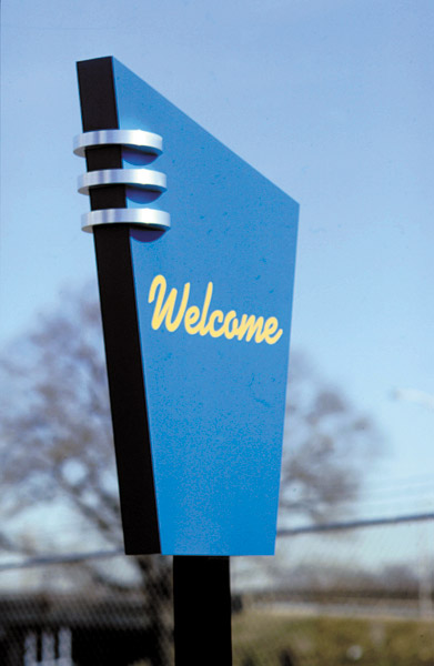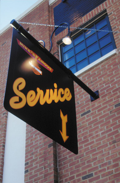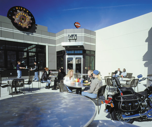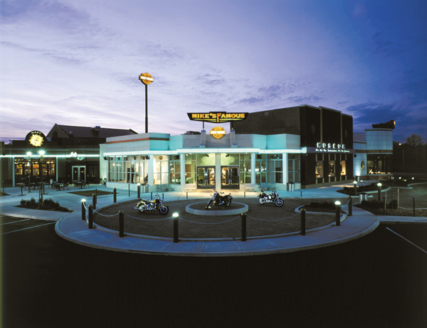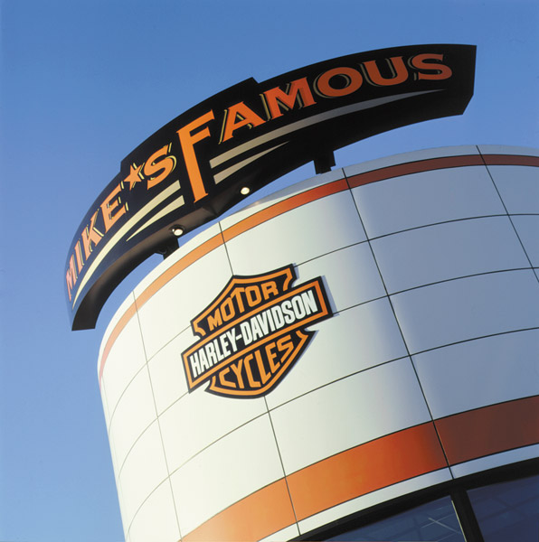 SP+O was the graphic consultant for Mike's Famous Roadside Rest, a themed Harley-Davidson dealership in Wilimington, Delaware at the foot of the Deleware Memorial Bridge. The dealership can best be described as a place where the freedom and romance of the American Road meets the strength and style of the Harley-Davidson brand. Our challenge was to create an identity and information graphics that used the fins and streamlined shapes of 50's automobiles, diners and service stations while working in a "turn-of-the-century" industiral style. The result is the worlds only Harley-Davidson dealership, restaurant, and museum destination.