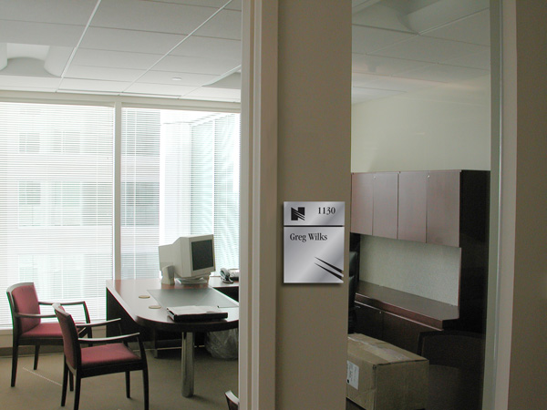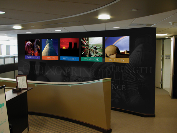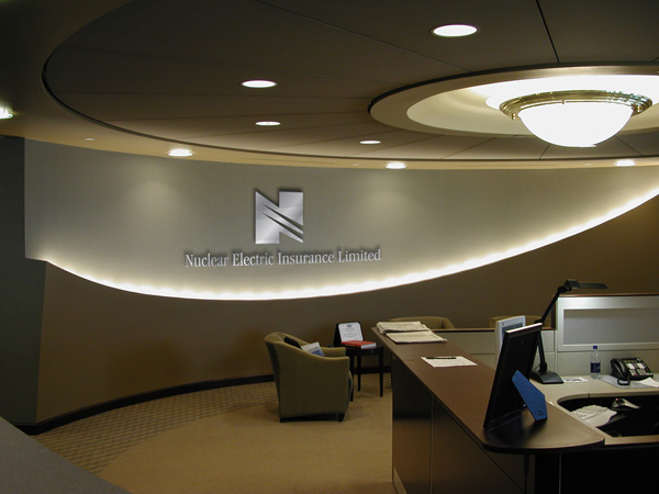 Interior identification sign system and digital graphics for the headquarters of Nuclear Electric Insurance Limited (NEIL). NEIL insures domestic and international nuclear utilities.
